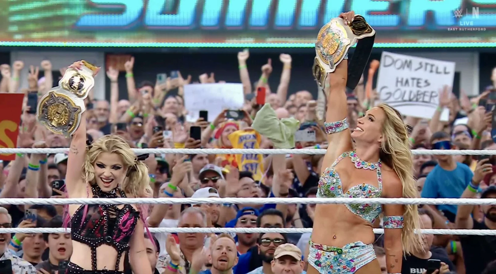 In a curious moment, Charlotte returned the doll named Lily back to Alexa Bliss while introducing her own doll, Charli, to the audience. Both dolls sported “We’re not friends” shirts, underscoring the playful yet complicated dynamic between the two women. Despite their constant refusal to claim friendship, their on-screen chemistry appears strong, with the crowd visibly enjoying their interactions.