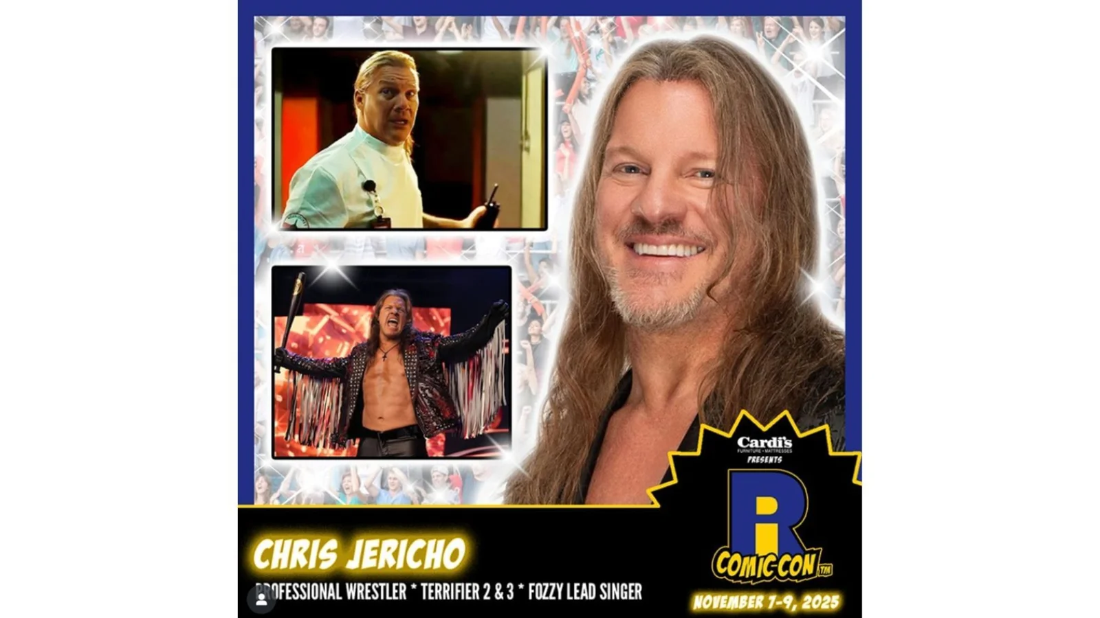 “#ICYMI @chrisjerichofozzy is coming to #RICC2025 November 7th & 8th at the @the_amppvd and @riconvention! Chris is a multiple time champion with the WWE/WWF, WCW, and CWC since 1996 and has been signed to All Elite Wrestling (#AEW) since January 2019. He is the lead singer for the heavy metal band Fozzy and played Adam Burke in Terrifier 2 & 3.”