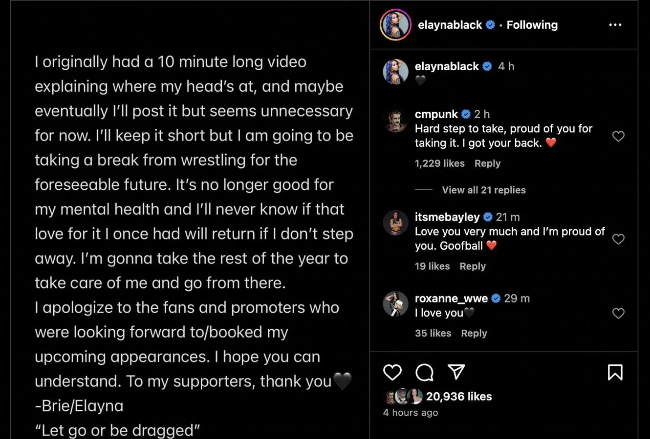 The announcement quickly received support from CM Punk, who has been both a close friend and mentor to Jade. Responding on Instagram, Punk expressed his pride in her decision to step back, writing,