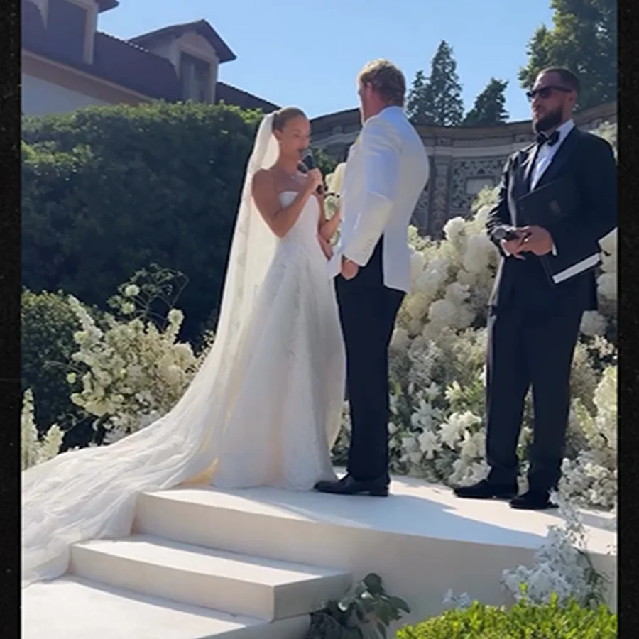After a two-year engagement announced in 2023, Logan Paul and Nina Agdal chose to exchange vows once again in Italy, the country where they first became engaged. The wedding took place outdoors at Lake Como, offering a picturesque backdrop that reflected the couple’s style and taste. Paul appeared in a classic white suit jacket with a black bow tie paired with black dress trousers, while Agdal wore a strapless, corseted lace dress that captured a blend of elegance and modern bridal fashion.