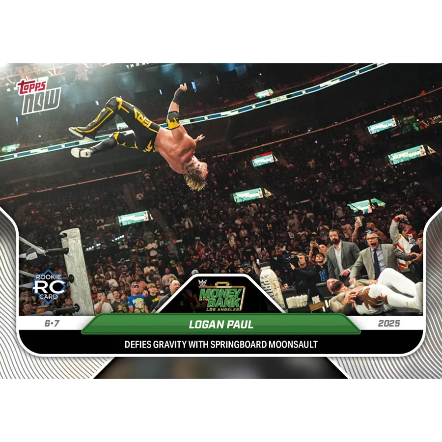 Among the initial cards, one features a striking image from the lead-up to a recent SmackDown episode, showing Logan Paul and John Cena side by side. In the photo, Paul holds the World Heavyweight Championship, while Cena displays the Undisputed Championship—an image sure to become a highlight for collectors. Another card captures Paul executing his signature Asai Moonsault on Jey Uso during the Money in the Bank event, recreating a memorable ringside moment on the announcer’s desk. With these cards, fans now have fresh memorabilia directly tied to some of WWE’s most exciting events.