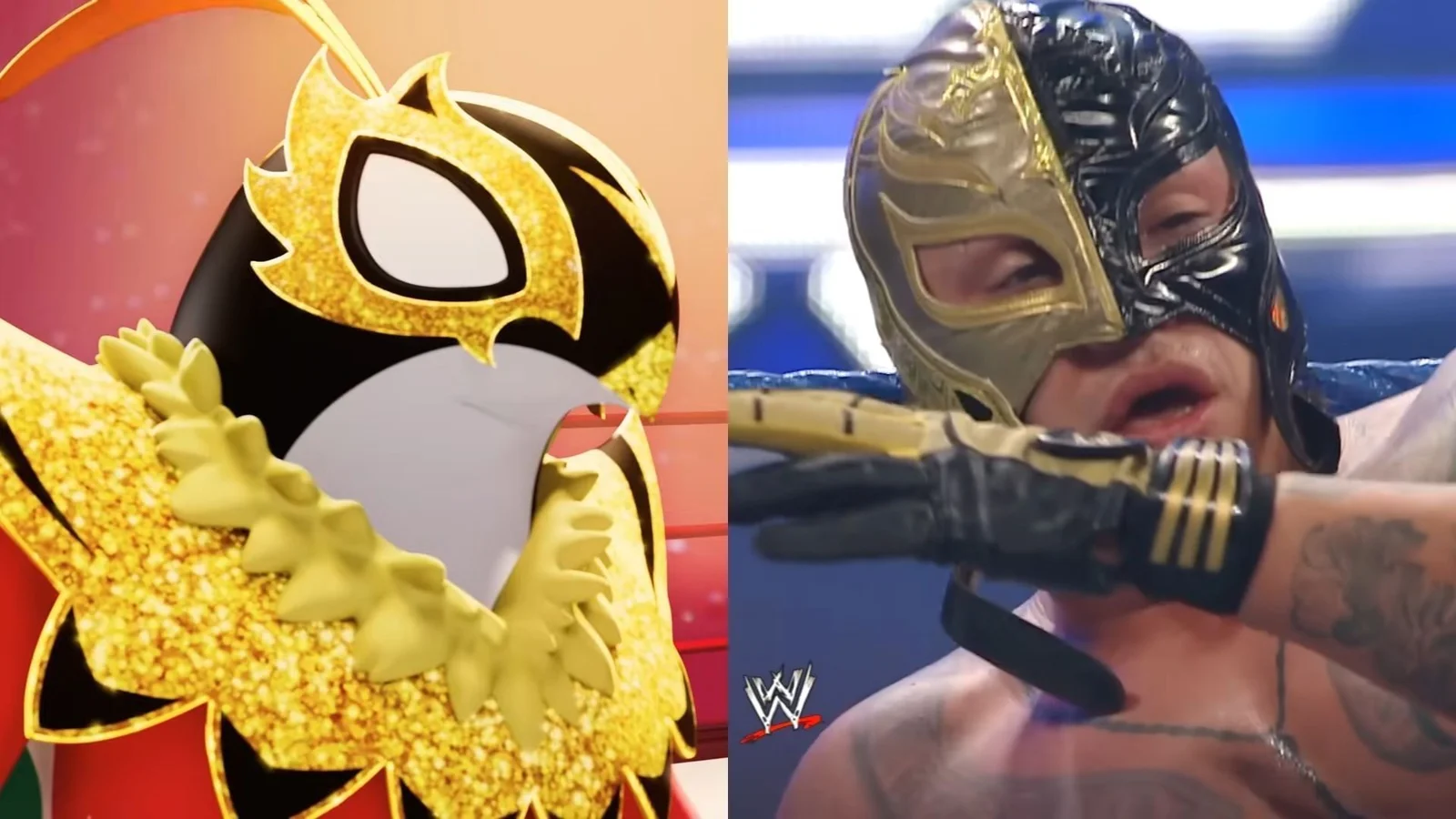 In this latest Mega Evolution form seen in Pokemon Legends Z-A, Hawlucha sports a new mask decorated with black and gold accents. These colors are notable because Rey Mysterio wore a similarly styled mask in several key matches around 2009, including bouts against the WWE wrestler Batista.